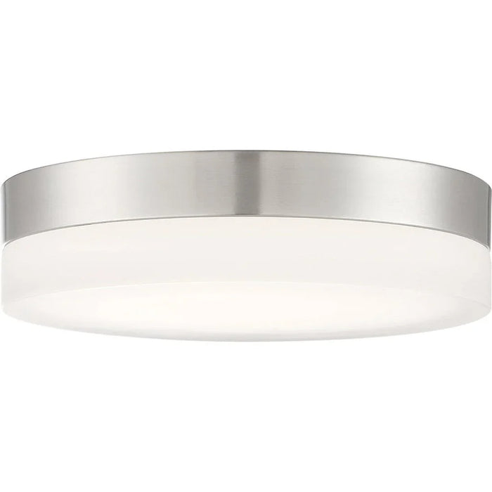 Satco's Pi 14 inch integrated LED flush mount features round white etched glass with a brushed nickel accent, offering a clean aesthetic, superior light quality and energy savings that can go anywhere. Illuminate kitchens, bathrooms, hallways, and office spaces with this sleek, round flush mount fixture. Dimmable and long-lasting, this fixture delivers 50,000 hours of warm white light.