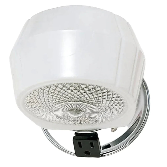 Nuvo's 1 light, 5 inch vanity fixture is a versatile and practical lighting solution. The polished chrome fixture provides users with superior illumination and the benefit of a three pronged convenience outlet for added functionality. The white and crystal glass of this vanity fixture adds elegance that pairs well with any home decor.