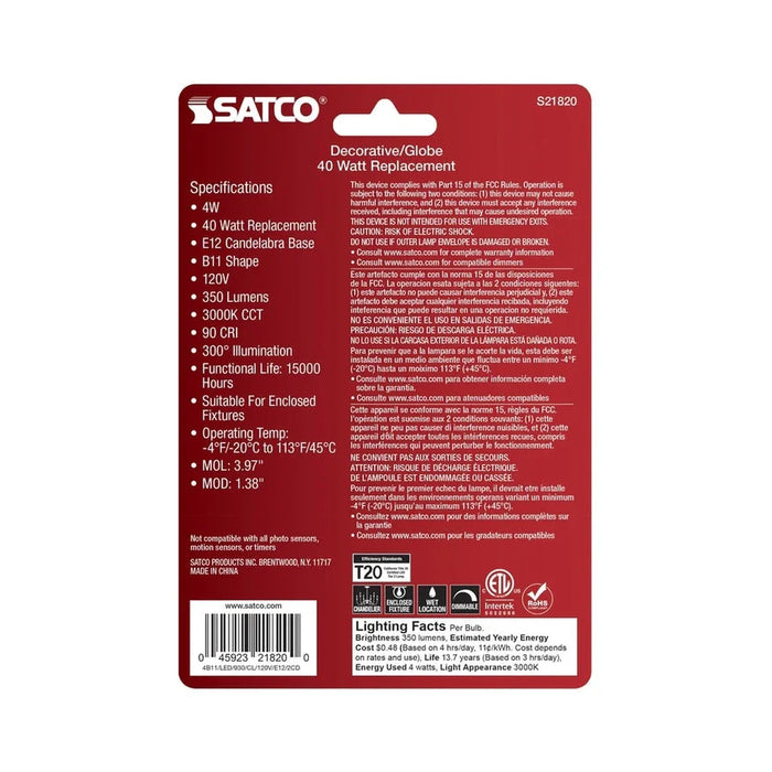 Satco's 4-watt, LED B11 bulb with a candelabra base is dimmable and offers soft white light and a 300 degree beam spread. Wet rated for kitchens and bathrooms, the carded 2-pack is suitable for retail display. Elegant and long-lasting, this clear bulb delivers 15,000 hours of exceptional illumination.