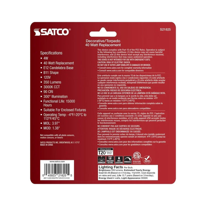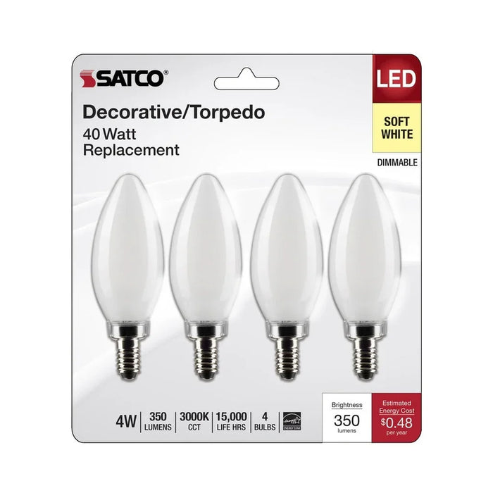 Satco's 4-watt, LED B11 bulb with a candelabra base is dimmable and offers soft white light and a 300 degree beam spread. Wet location rated for kitchens and bathrooms, the carded 4-pack is suitable for retail display. Elegant and long-lasting, this frosted bulb delivers 15,000 hours of exceptional illumination.