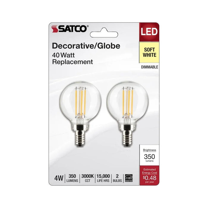 Satco's 4-watt clear, LED G16.5 bulb with a candelabra base is dimmable and offers soft white light and a 300 degree beam spread. Wet rated for kitchens and bathrooms, the carded 2-pack is suitable for retail display. Elegant and long-lasting, this clear bulb delivers 15,000 hours of exceptional illumination.