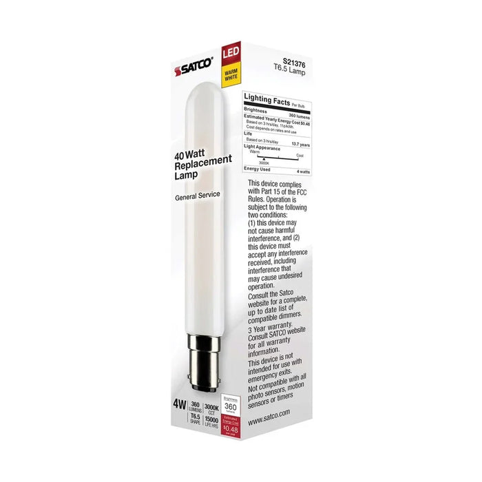 4W T6.5 LED - Frosted - Double Contact Bayonet Base - 3000K - 360 Lumens - 120V