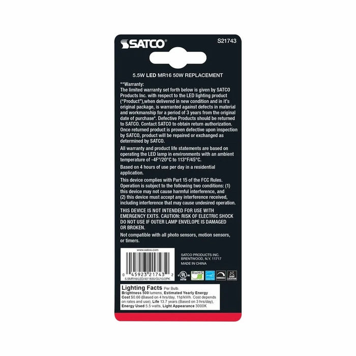 Satco's 5.5-watt MR16 ENERGY STAR bulb, is dimmable and offers warm white light and a 40 degree beam spread. The bulb has a GU10 base and is damp rated for kitchens and bathrooms. Available in a 2-pack, this long-lasting bulb delivers 25,000 hours of exceptional illumination.