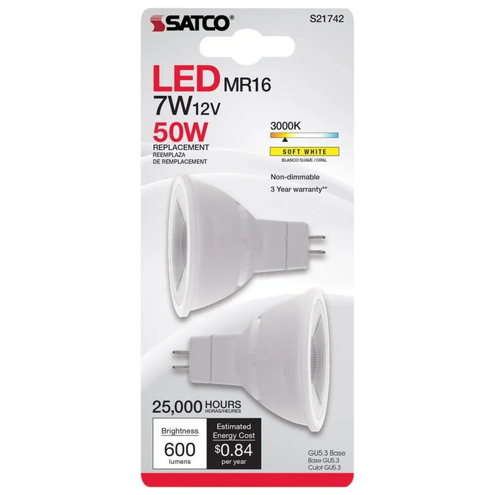 Satco's 7-watt MR16 LED bulb features a bi-pin, GU5.3 base, offers warm white light, and a 40 degree beam spread. The bulb is damp rated for use in kitchens and bathrooms and is available in a 2-pack. This long-lasting lamp delivers 25,000 hours of exceptional illumination.