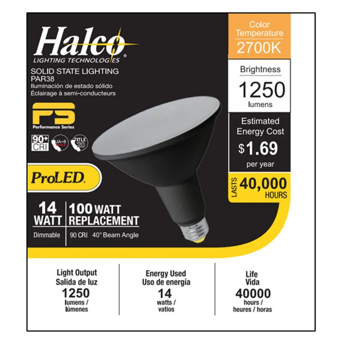 Halco LED PAR38 Flood 14W 2700K 40Deg Dimmable 90+ CRI 1250 Lumen Black Housing T20 T24 JA8-2019 (Performance Series) (6-Pack). Warm White LED PAR Floods.