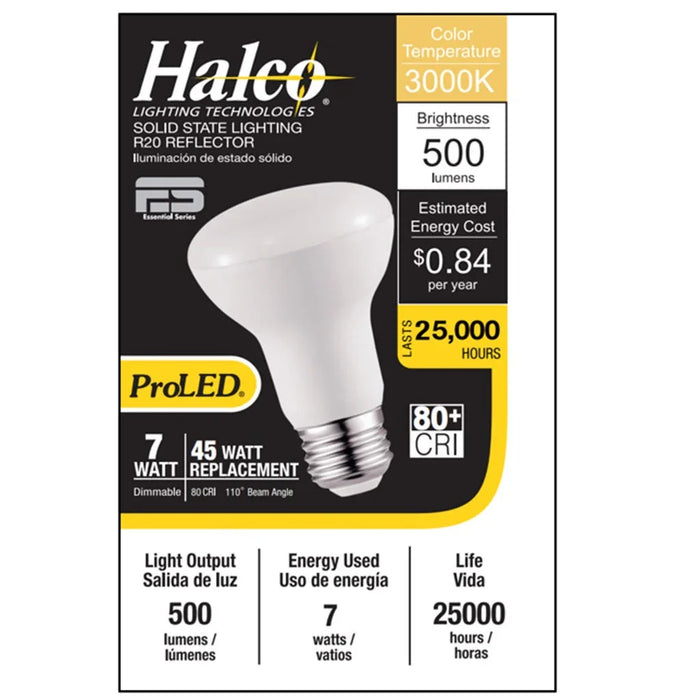 Halco LED R20 Flood 7W 3000K Dimmable 80+ CRI 500 Lumen White Housing (Essential Series) (6-Pack). Soft White LED Reflector Floods.