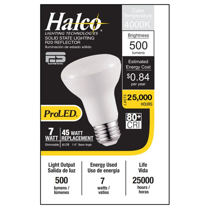 Halco LED R20 Flood 7W 4000K Dimmable 80+ CRI 500 Lumen White Housing (Essential Series) (6-Pack). Neutral White LED Reflector Floods.