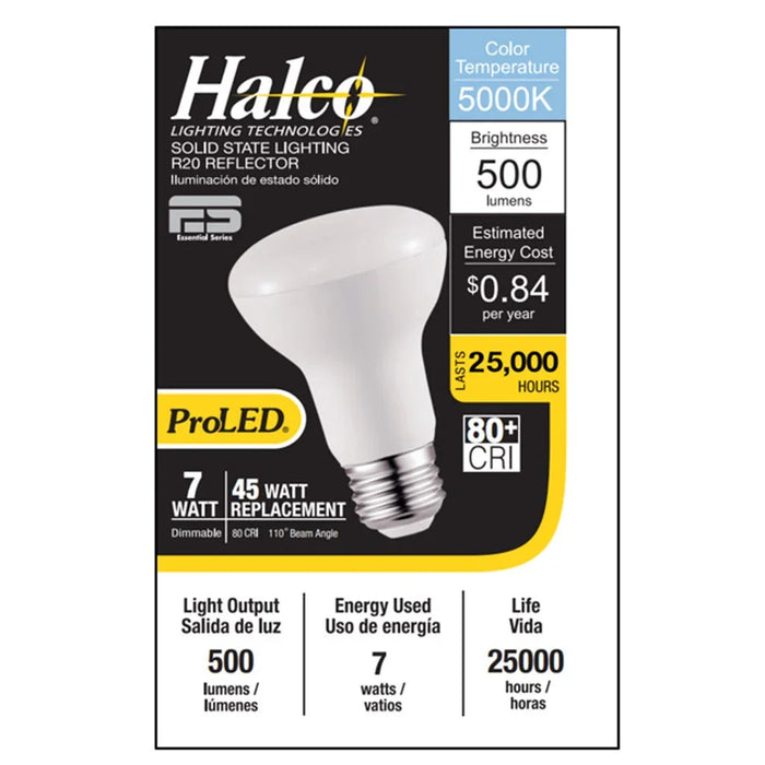 Halco LED R20 Flood 7W 5000K Dimmable 80+ CRI 500 Lumen White Housing (Essential Series) (6-Pack). Cool White LED Reflector Floods.
