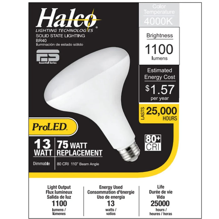 Halco LED BR40 Flood 13W 4000K Dimmable 80+ CRI 1100 Lumen White Housing (Essential Series) (6-Pack). Neutral White LED BR (Bulged Reflector) Floods.