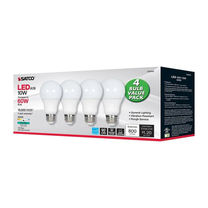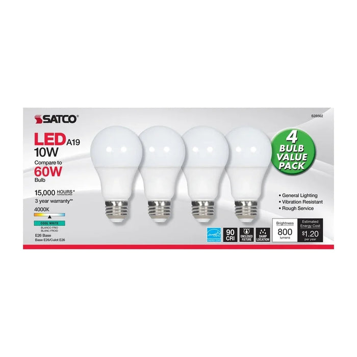 10W - A19 LED - Frosted - 4000K - Medium base - 120V - 4-PACK