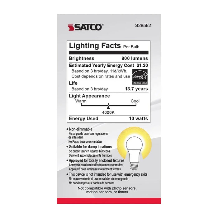 Satco's 10-watt frosted LED bulb offers cool white light and a 220 degree beam spread. Illuminate living rooms, dining rooms, hallways, and office spaces with this sleek, energy efficient lamp. Available in a 4-pack, this lamp delivers 15,000 hours of illumination.
