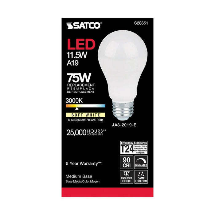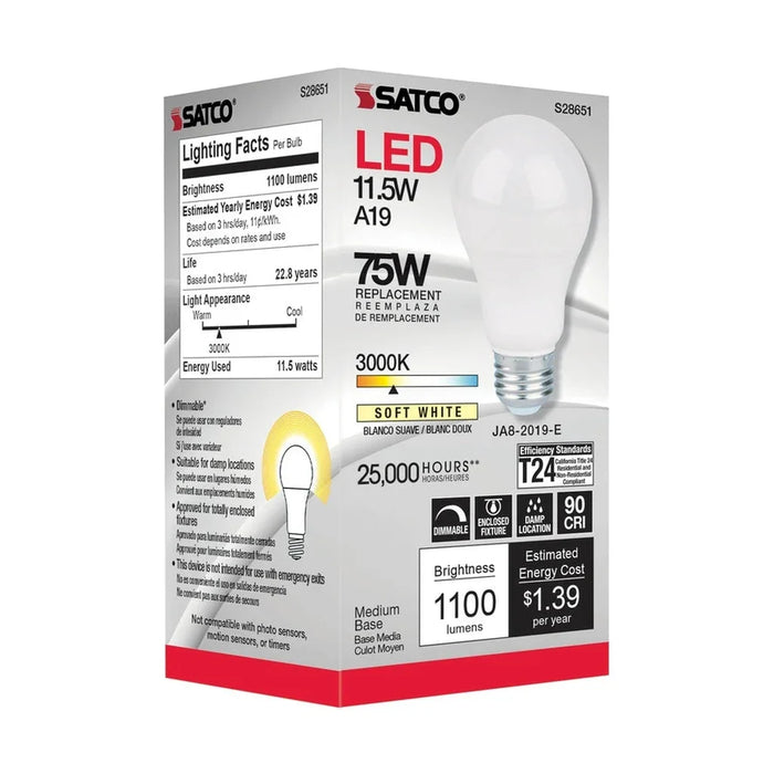 Satco's 11.5-watt, A19 LED lamp is a sleek lighting solution for residential and commercial applications. Illuminate living rooms, dining rooms, hallways, and office spaces with this elegant white bulb. Dimmable and versatile, this lamp delivers 25,000 hours of warm white light.