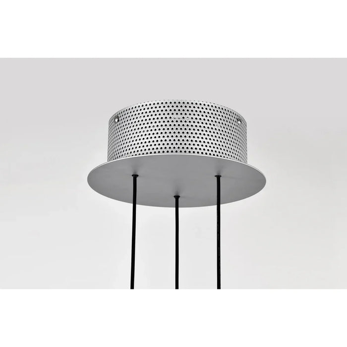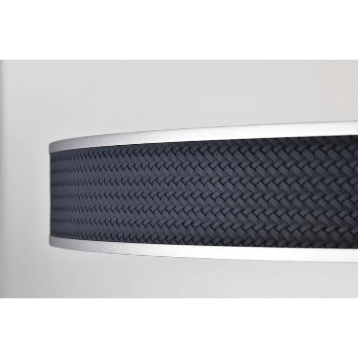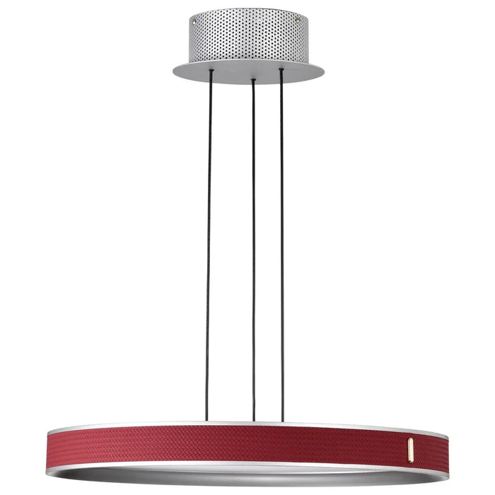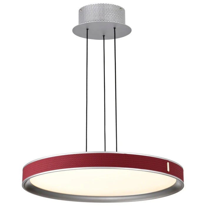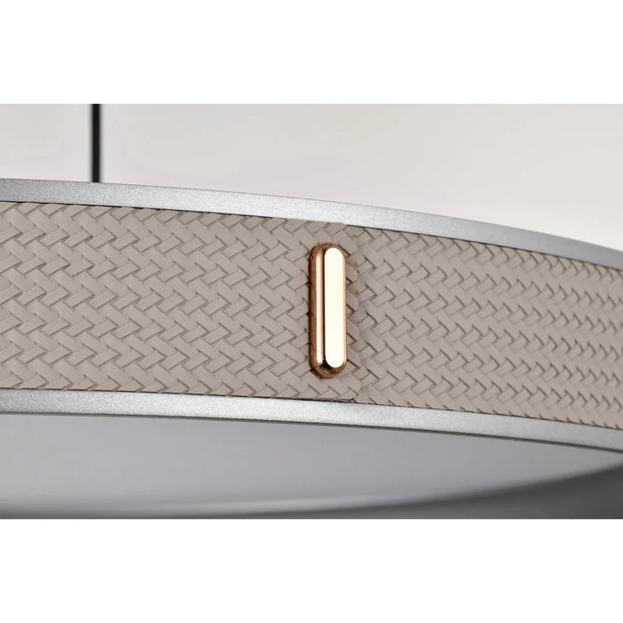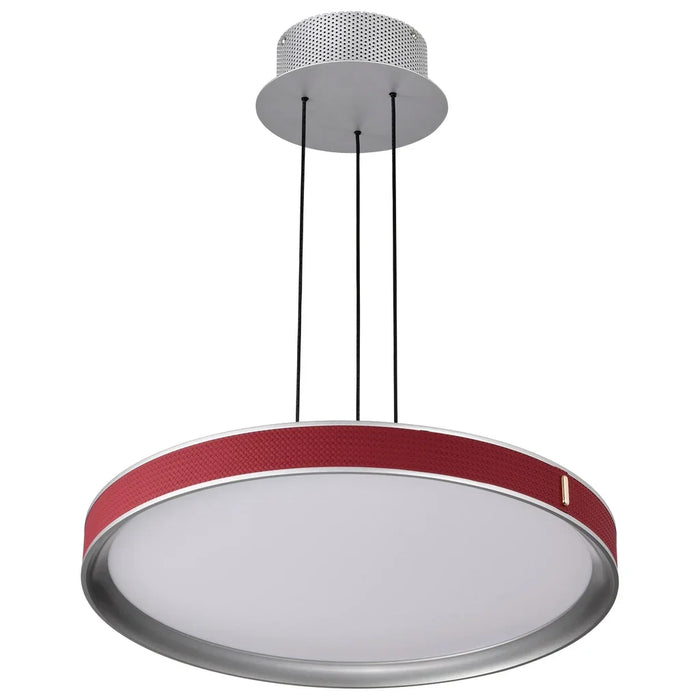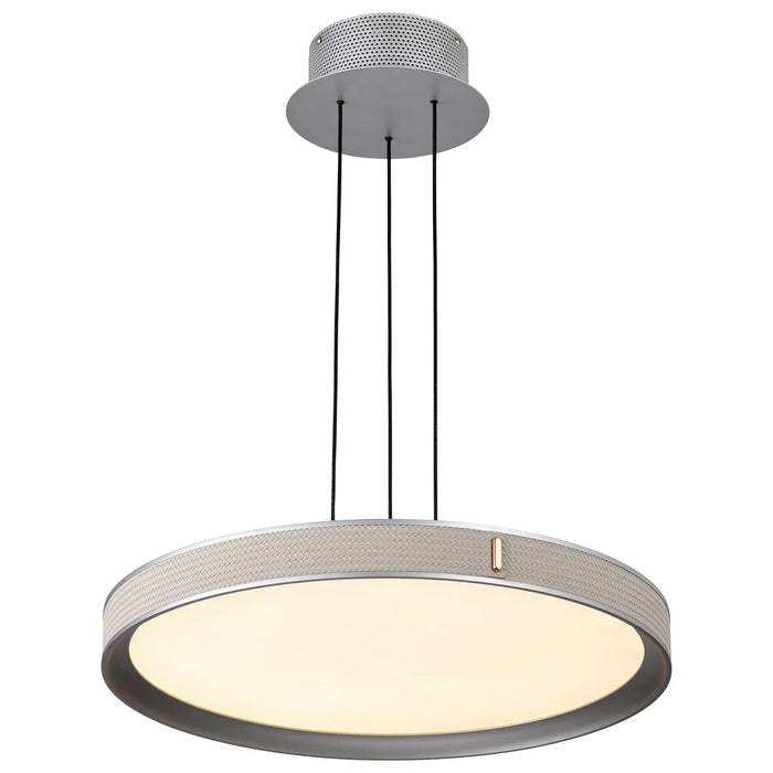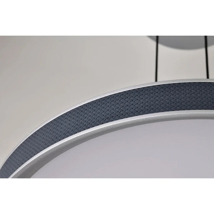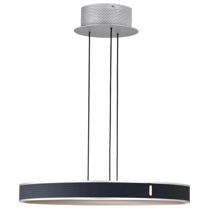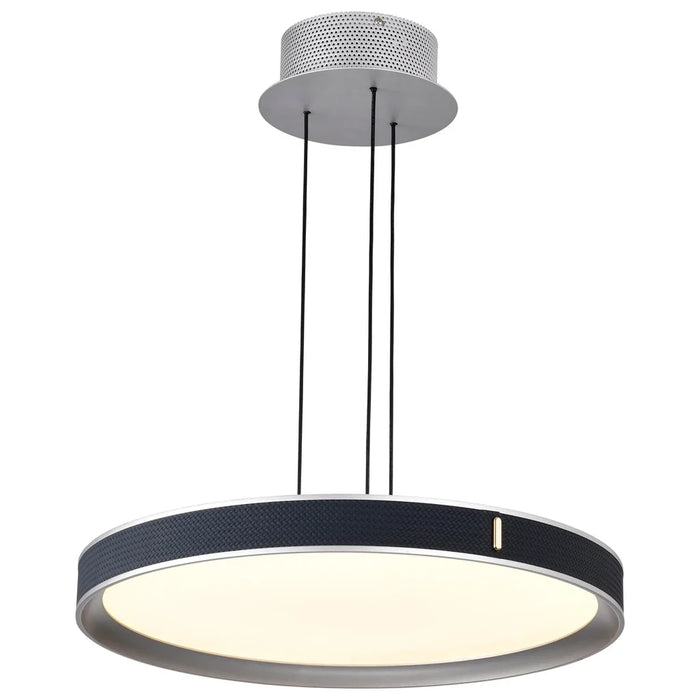 - Bandon LED 19.5-inch pendant finished in gray with a blue faux leather wrap and acrylic lens