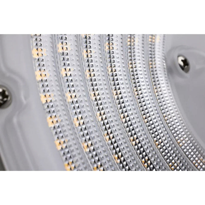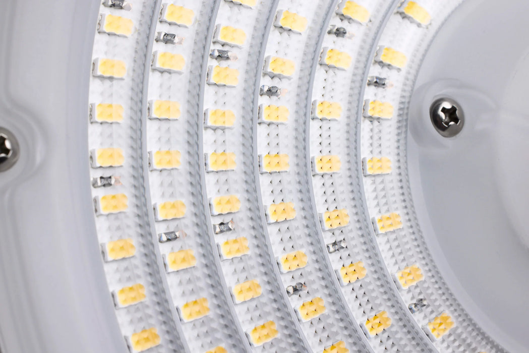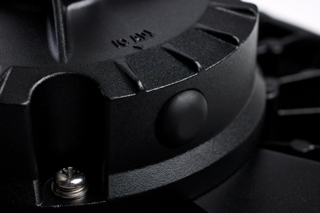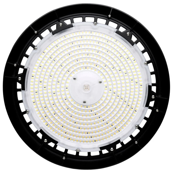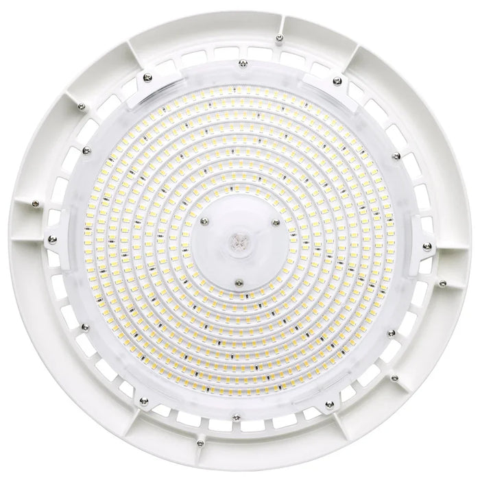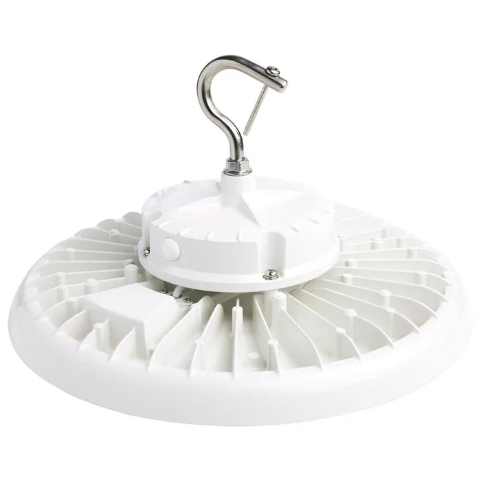 Introducing SATCO|NUVO's newest generation of UFO high bays. These cULus listed products are offered in 4000K and 5000K in 100W, 150W, 200W and 240W (120-277V) in white and black finishes and 200W and 240W (277V-480V) in black. They feature an integrated, sensor port for easy field installation of an add on microwave sensor. They have a 90 degree beam angle, a locking hook, are IP65, 0-10V dimmable, and feature 6KV surge Protection. They are rated for 50,000 hours and carry a 5-year warranty. Offered with these is a full suite of accessories including yoke mounts, pendant adapters, protective cages, anti-glare shields, a sensor and remote and an add on EM.