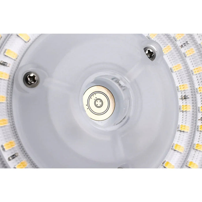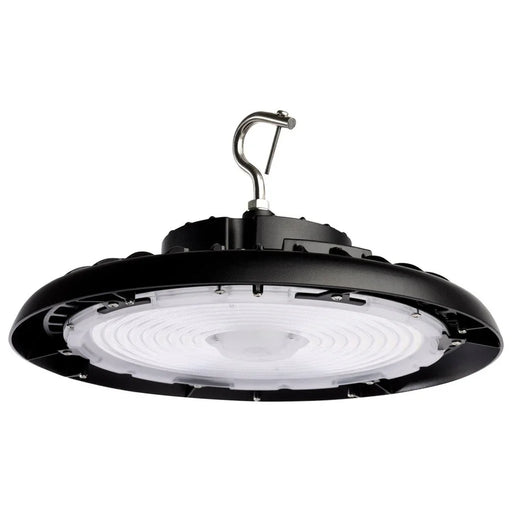 Introducing SATCO|NUVO's newest generation of UFO high bays. These cULus listed products are offered in 4000K and 5000K in 100W, 150W, 200W and 240W (120-277V) in white and black finishes and 200W and 240W (277V-480V) in black. They feature an integrated, sensor port for easy field installation of an add on microwave sensor. They have a 90 degree beam angle, a locking hook, are IP65, 0-10V dimmable, and feature 6KV surge Protection. They are rated for 50,000 hours and carry a 5-year warranty. Offered with these is a full suite of accessories including yoke mounts, pendant adapters, protective cages, anti-glare shields, a sensor and remote and an add on EM.