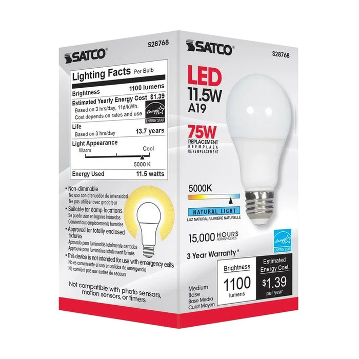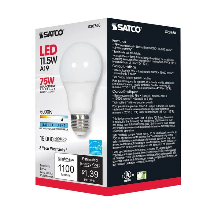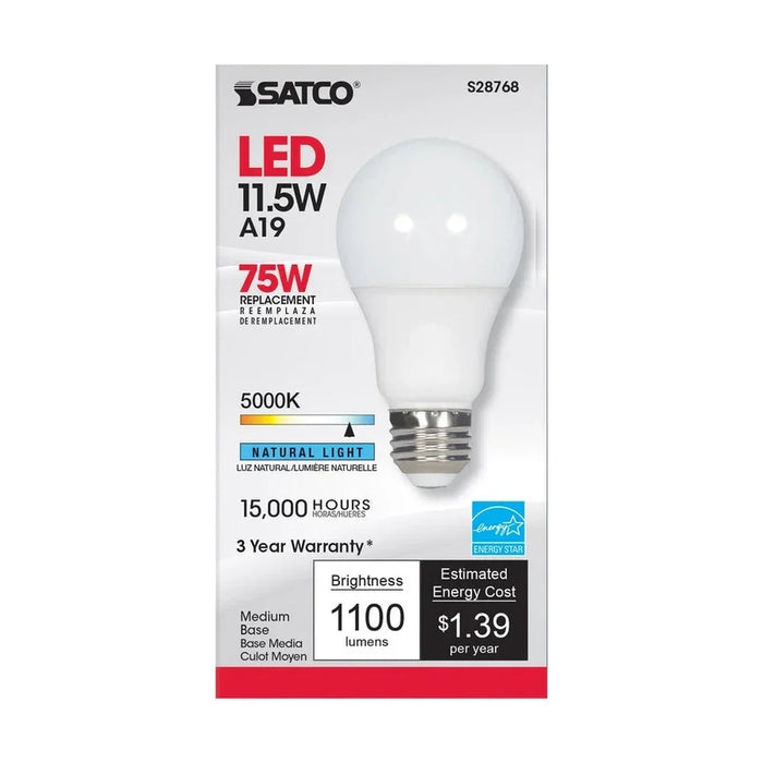 Satco's 11.5-watt, A19 LED lamp is a sleek lighting solution for residential and commercial applications. Illuminate living rooms, dining rooms, hallways, and office spaces with this elegant white bulb. Versatile, with a high lumens count, this lamp delivers 15,000 hours of cool white light.