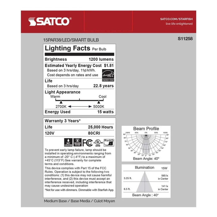 15W - PAR38 LED - RGB & Tunable White - Starfish IOT - 120V - 1200 Lumens