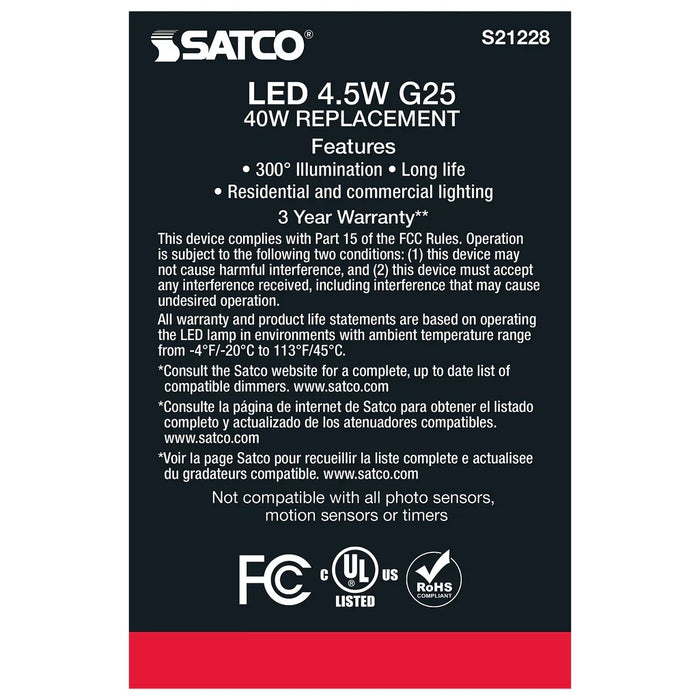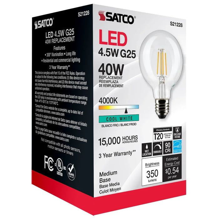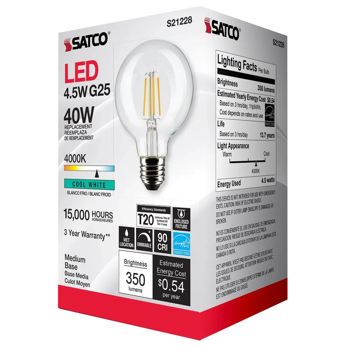 SATCO 4.5 Watt G25 LED - Clear - Medium base - 90 CRI - 4000K - 120 Volt. Sold as a 6-Pack.