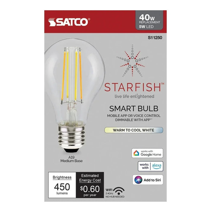 The LED 5 watt A19 clear tunable white filament bulb combines a vintage look and modern technology. Endless variations of warm to cool whites, which range between 2700K and 5000K, adds intrigue to your home. The lamp has an E26 medium base, is both enclosed fixture rated and damp location rated, and dimmable with the STARFISH app.