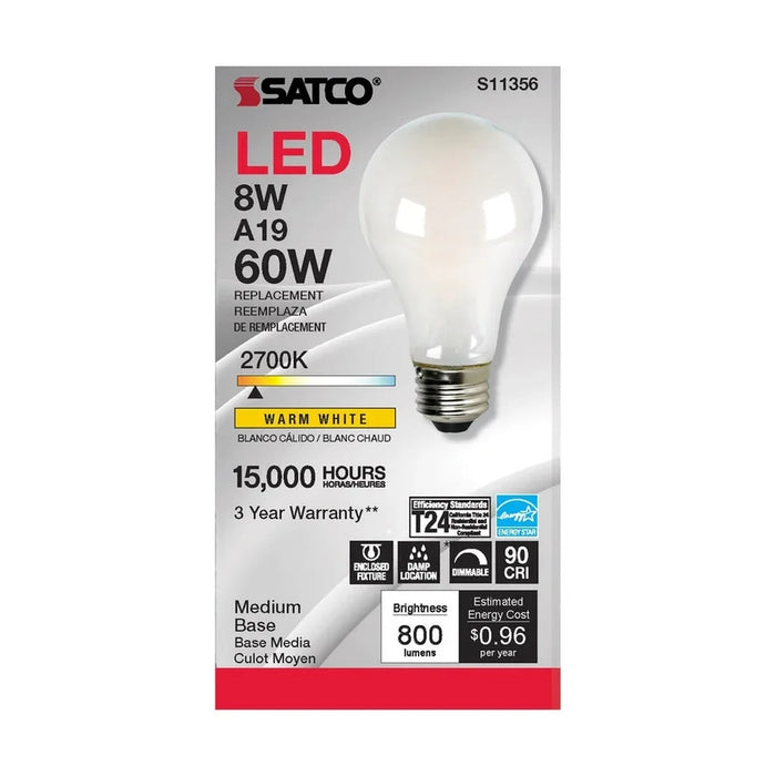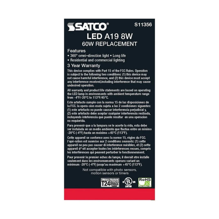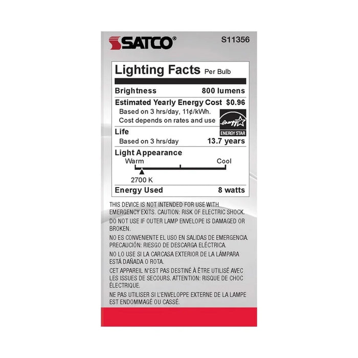 Satco's 8-watt LED bulb is an elegant and traditional lighting solution for the home. Illuminate dining rooms, living rooms, and office spaces with this dimmable, white bulb. Featuring a beam spread of 360 degrees, this bulb delivers 15,000 hours of warm white light.