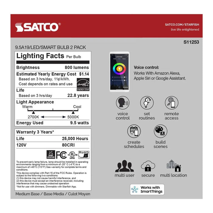 The two-pack 9.5 watt color-changing and tunable white A19 lamp replaces a standard 60 watt bulb. The lamp offers dynamic color-changing light and thousands of whites that range from 2700K - 5000K.Dimming, colors, and CCT settings are controlled with the STARFISH app.