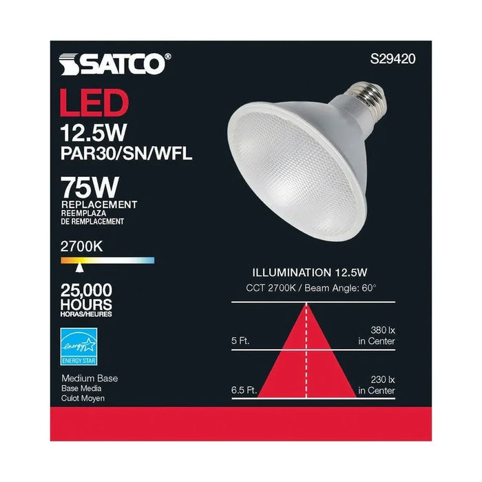 Satco's LED 12.5-watt, PAR30SN lamp maintains the familiar look of the Halogen PAR and Gen1 LED lamps they replace; but at 90 CRI and a higher lumens per watt ratio, it delivers superior light and improved efficiency. Designed for use in track, recessed fixtures and wet locations including outdoor and landscape applications, this versatile lamp has a multitude of applications. This lamp is dimmable and delivers 25,000 hours of warm white light.