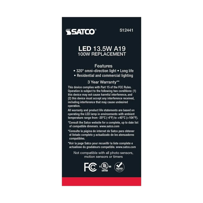 Satco's 13.5-watt LED lamp is traditional, yet contemporary with its sleek finish and energy saving LED technology. Elegantly illuminate any room in the house with this 4 pack of dimmable bulbs. Sophisticated and modern, this lamp delivers 15,000 hours of soft white light.