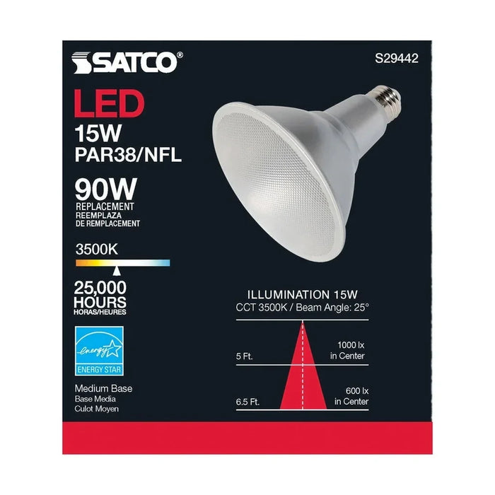 Satco's LED 15-watt, PAR38 lamp maintains the familiar look of the Halogen PAR and Gen1 LED lamps they replace; but at 90 CRI and a higher lumens per watt ratio, it delivers superior light and improved efficiency. Designed for use in track, recessed fixtures and wet locations including outdoor and landscape applications, this versatile lamp has a multitude of applications. This lamp is dimmable and delivers 25,000 hours of neutral white light.