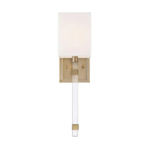 NUVOThe Thompson glass stem 1 Light candelabra sconce is smartly finished with a square white linen shade. Supported by a burnished brass back drop, th...
