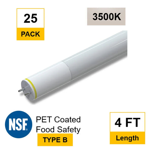 View full detailsLED T8 PET Coated Linear Tube 14W 48in 3500K Type B Double-Single Ended Bypass 120-277V 1800 Lumen 50000 hrs Medium Bi-Pin (G13) Base 80 CRI (25-Pack)