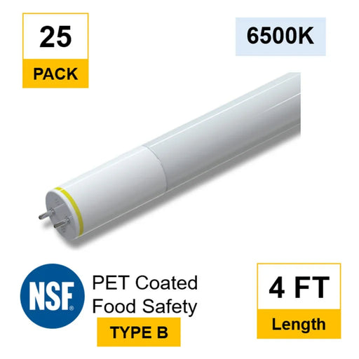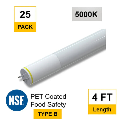 View full detailsLED T8 PET Coated Linear Tube 14W 48in 6500K Type B Double-Single Ended Bypass 120-277V 1800 Lumen 50000 hrs Medium Bi-Pin (G13) Base 80 CRI (25-Pack)