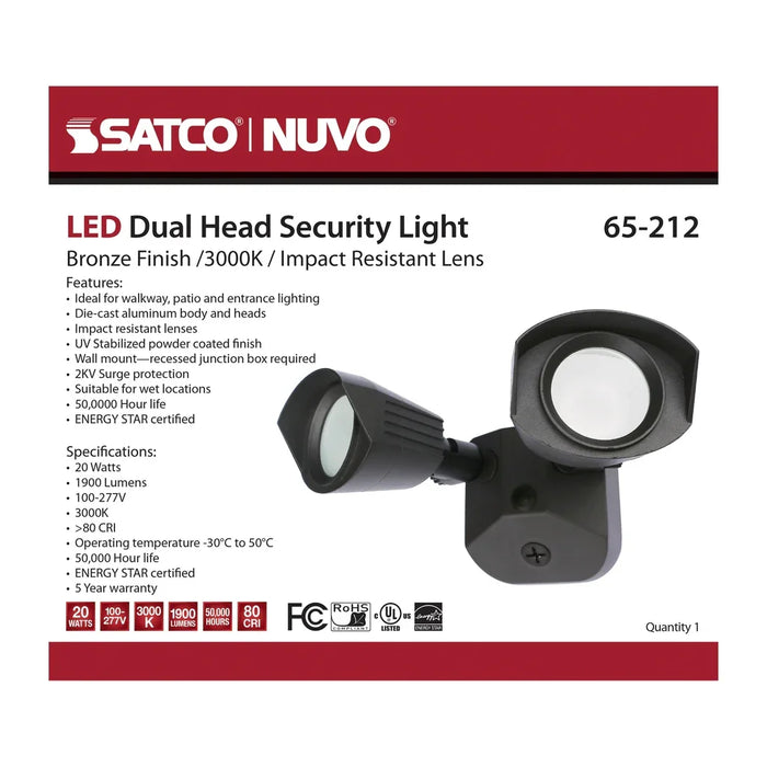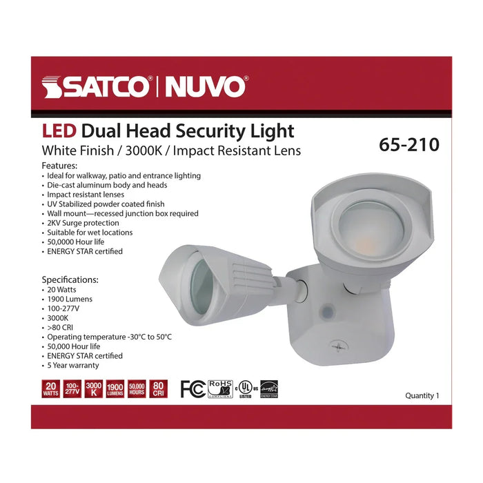 The NUVO frosted 20-watt LED dual head security light offers warm white lighting in a white finish. The fixture is ENERGY STAR qualified and features a 50 degree beam spread. This dual head security light delivers 50,000 hours of exceptional illumination.