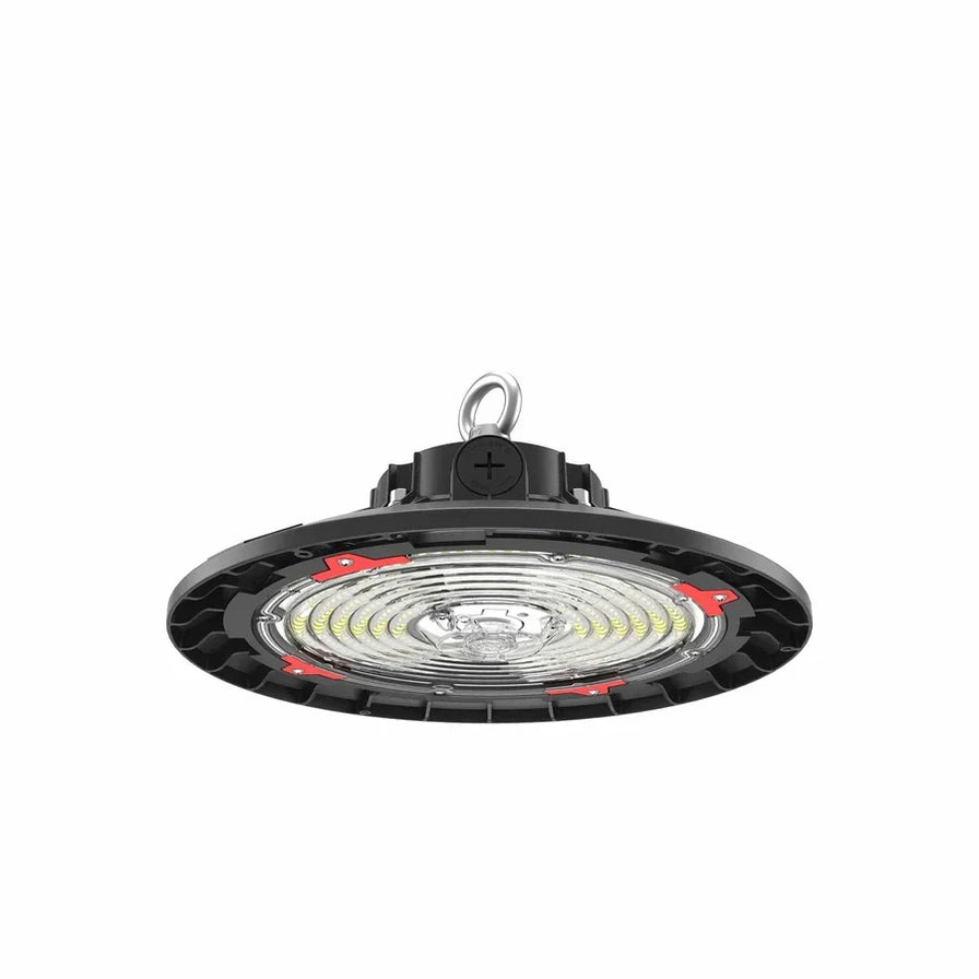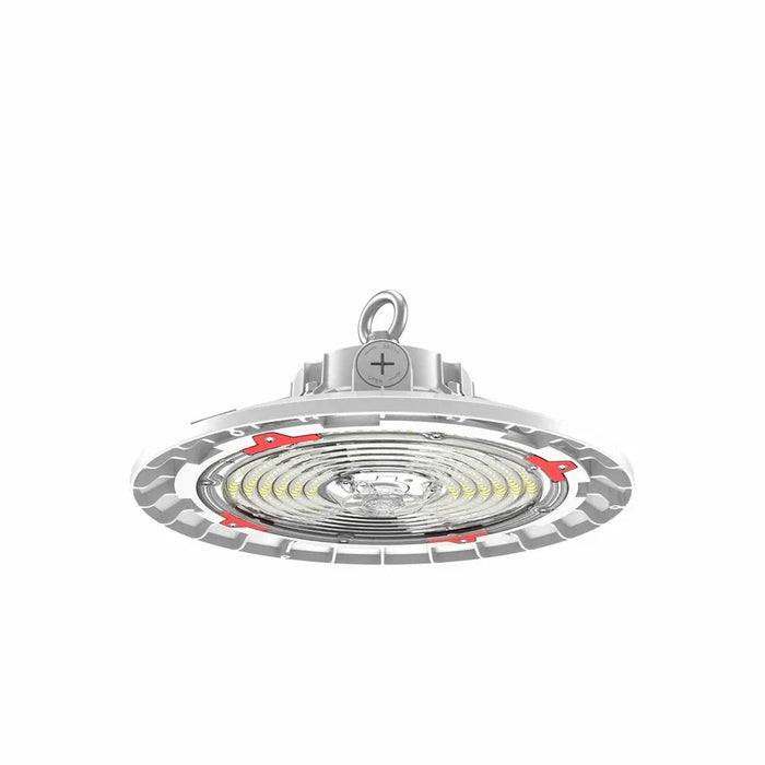 Keystone's 150W Power & Color Selectable Round Highbay Gen 2 |150W/100W/70W | 90 deg lens | 11-inch diameter |120-277V | 3000K/4000K/5000K | 0-10V Dimming | Built-in sensor receptacle O-Bolt & J-Hook Included. Used for commercial and industrial high bay lighting applications. Compact Round LED High Bay Fixture.