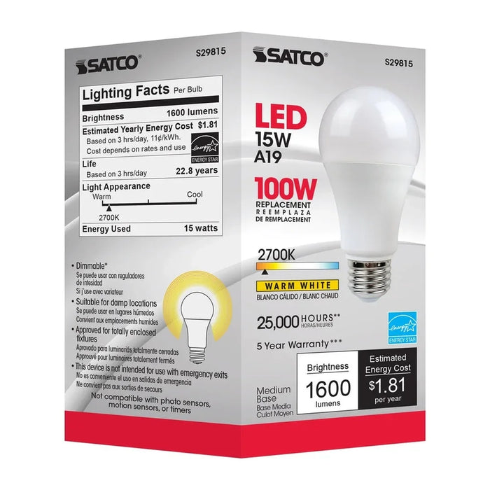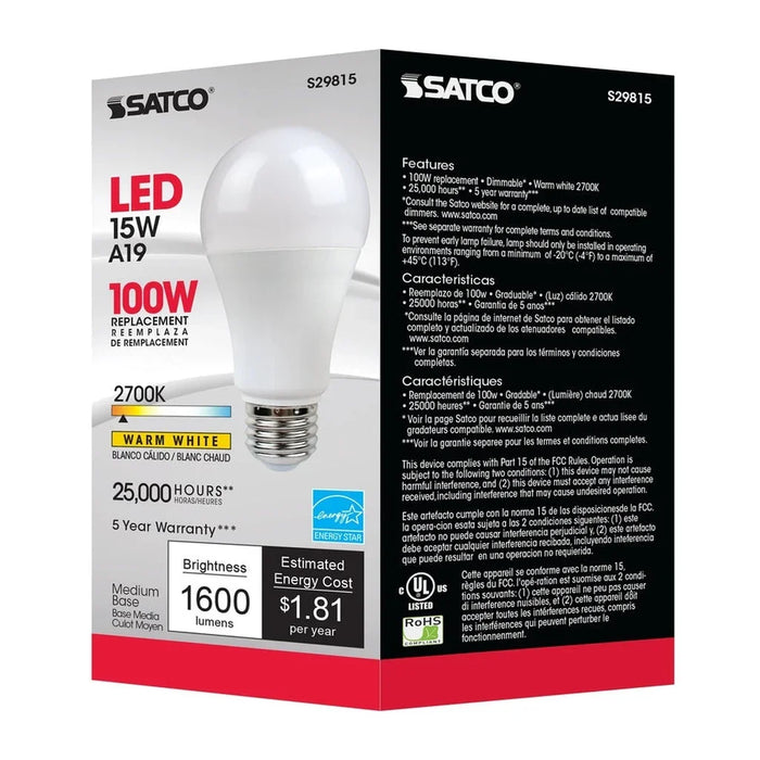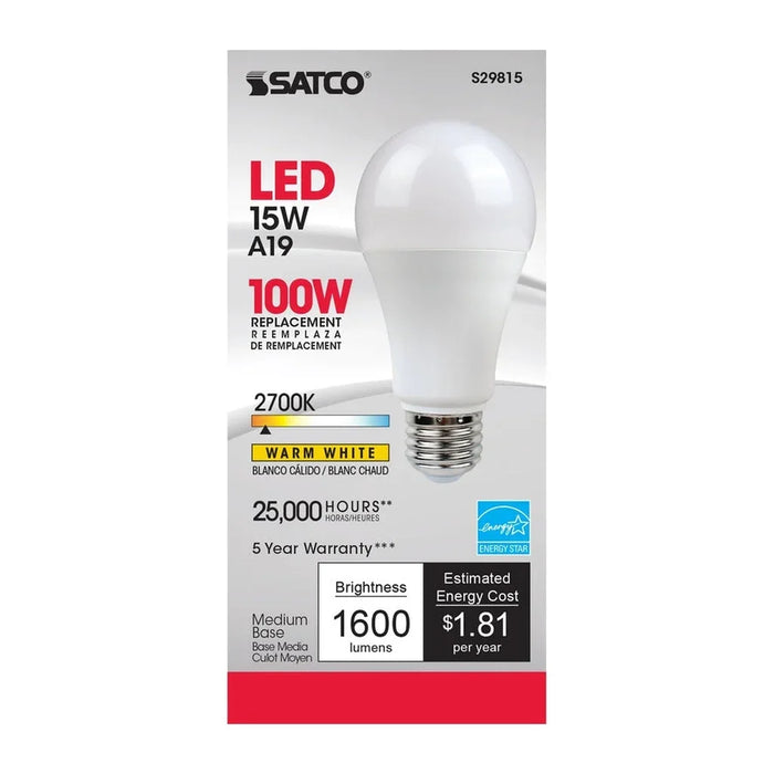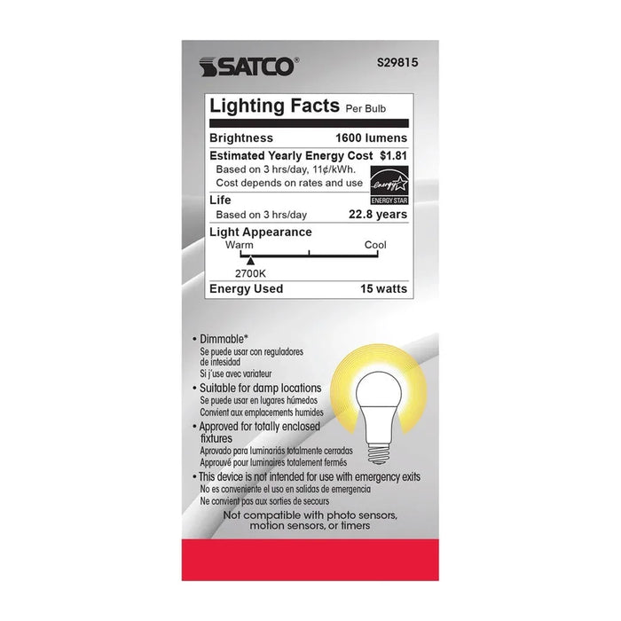 15W - A19 LED - Frosted - 2700K - Medium base - 220 deg. Beam Angle - 120V