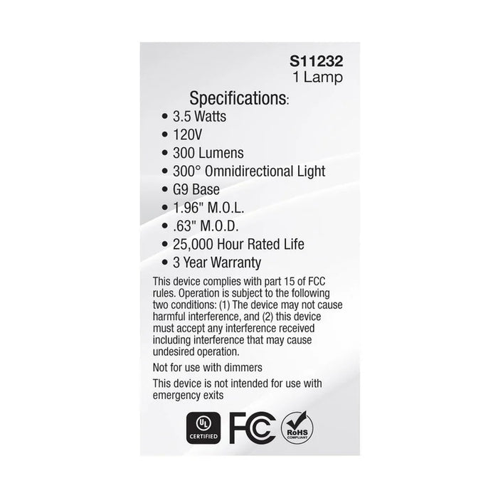 Transform your surroundings with SATCO|NUVO’s S11232 3.5-watt, T4, G9-base, Halogen replacement lamp, engineered for optimal energy efficiency and affordability. With a CCT of 3000K and emitting a 300-degree omni-directional light, this lamp is ideal for accentuating various settings. Find the perfect lighting solution for chandeliers, display lighting, landscapes, displays and more with the brilliantly focused light of this lamp, tailored to meet your needs.