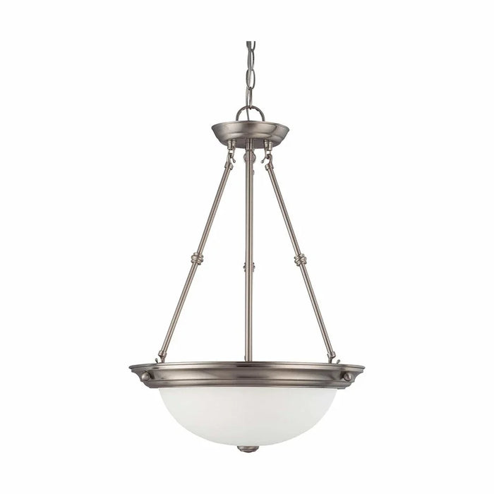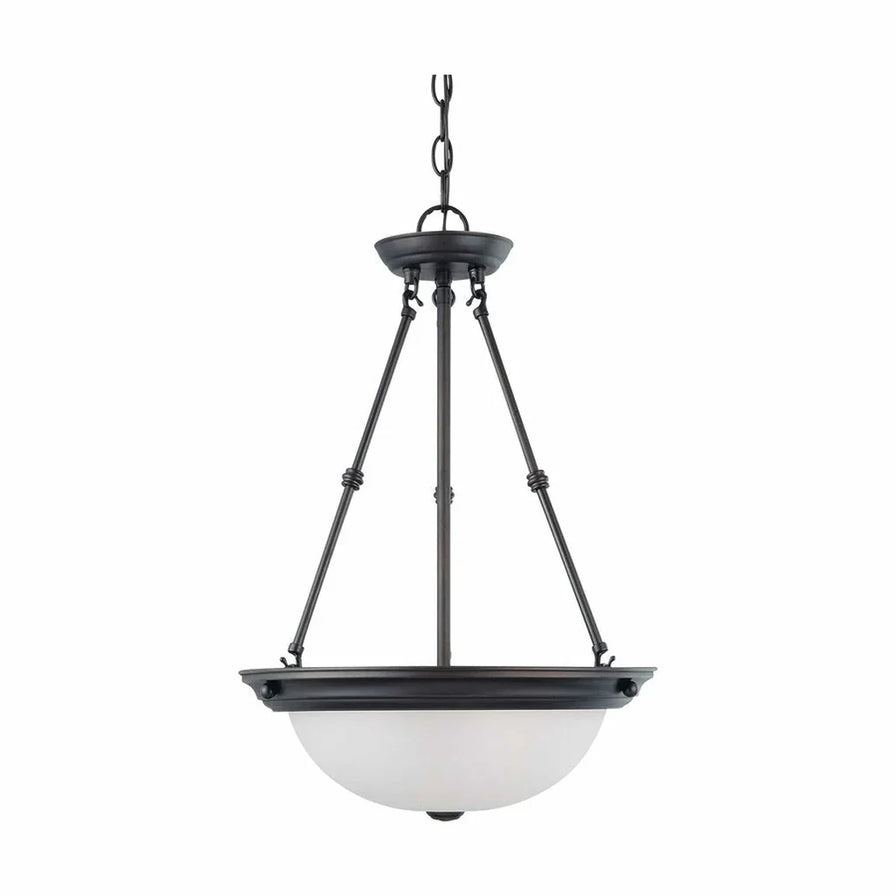 Satco's 3 light, 15 inch pendant fixture features a deep rich mahogany bronze finish, accented by frosted white glass. Illuminate living rooms, dining rooms, and foyers with this elegant pendant. Traditional, yet contemporary, this 3 light pendant adds style to the home.