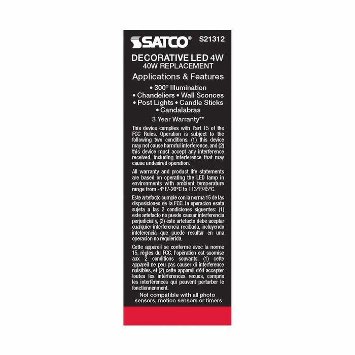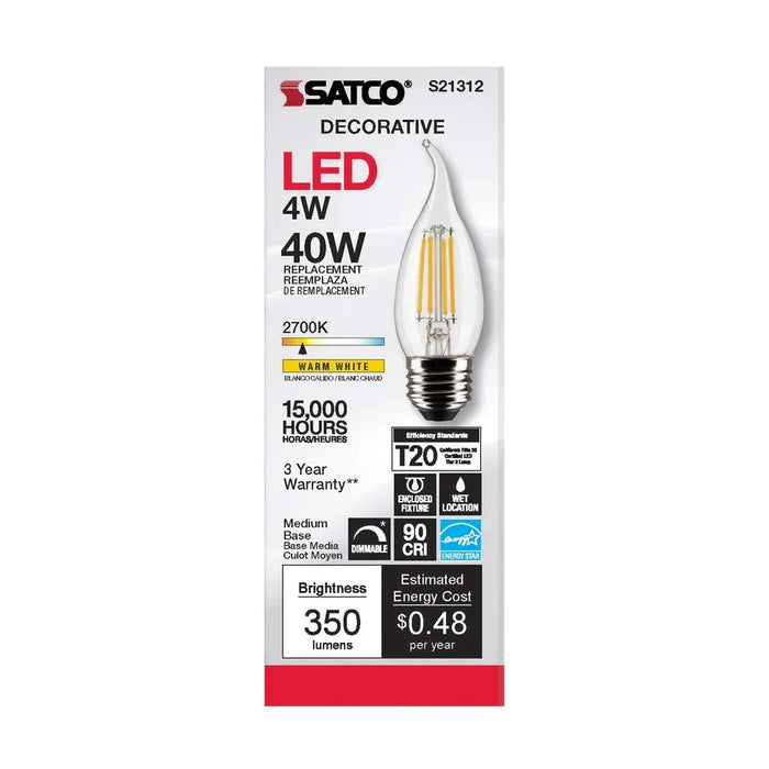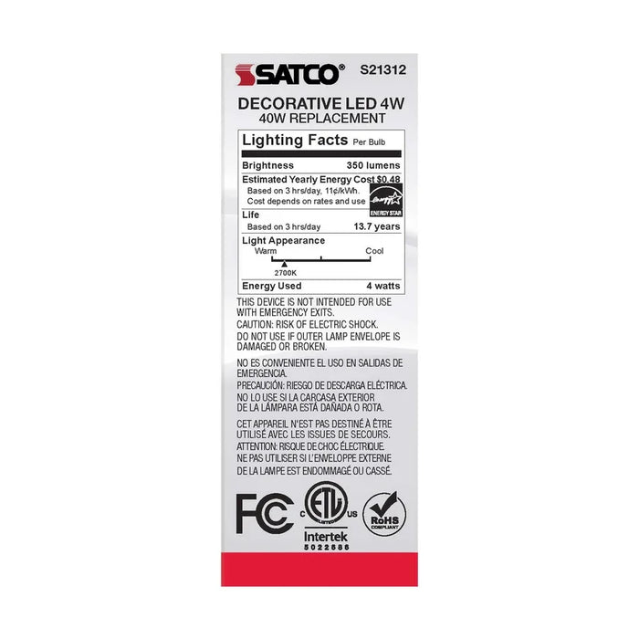 Satco's 4-watt LED lamp is traditional, yet contemporary with its vintage style and energy saving LED technology. Elegantly illuminate any room in the house with this dimmable, clear bulb. Sophisticated and modern, this lamp delivers 15,000 hours of warm white light.