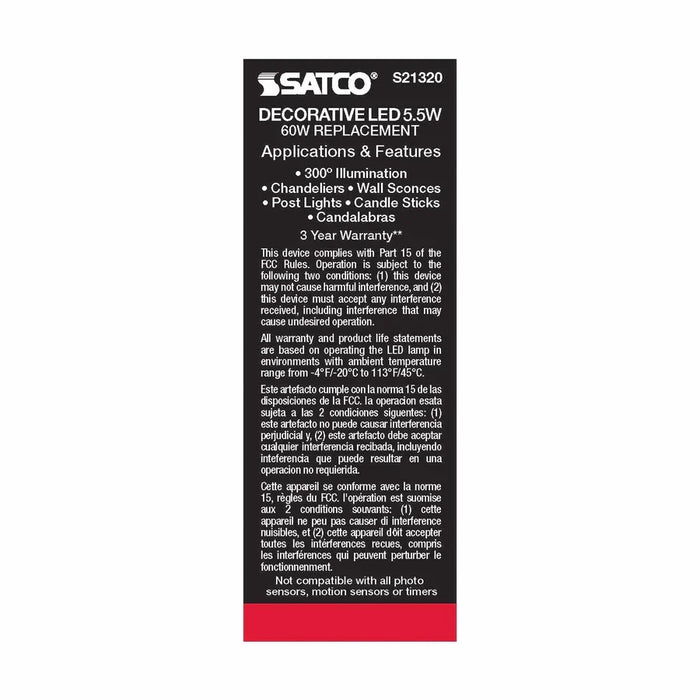 Satco's 5.5-watt, LED lamp is traditional, yet contemporary with its sleek finish and energy saving LED technology. Elegantly illuminate any room in the house with this dimmable, frost finished bulb. Sophisticated and modern, this lamp delivers 15,000 hours of warm white light.