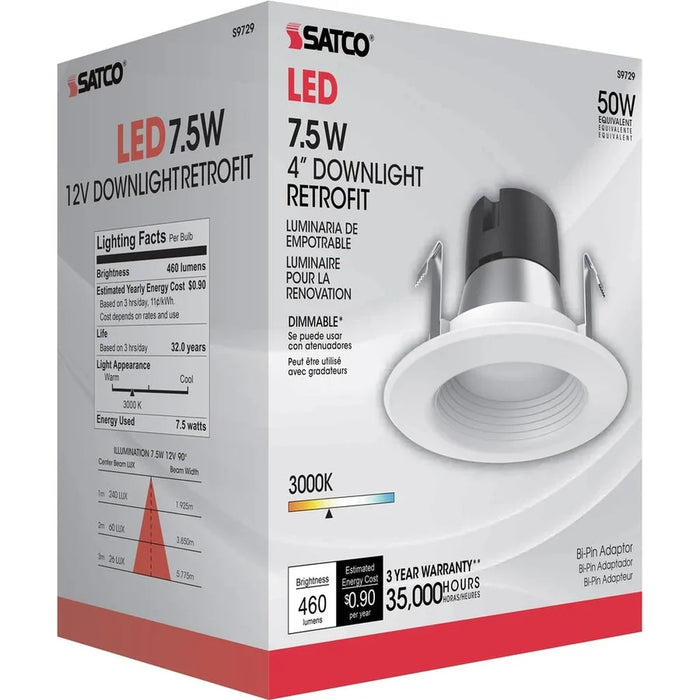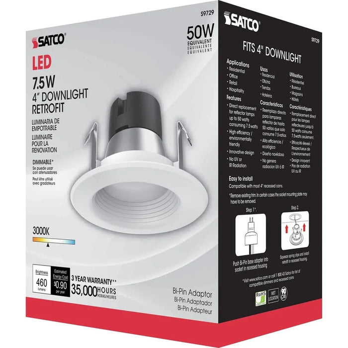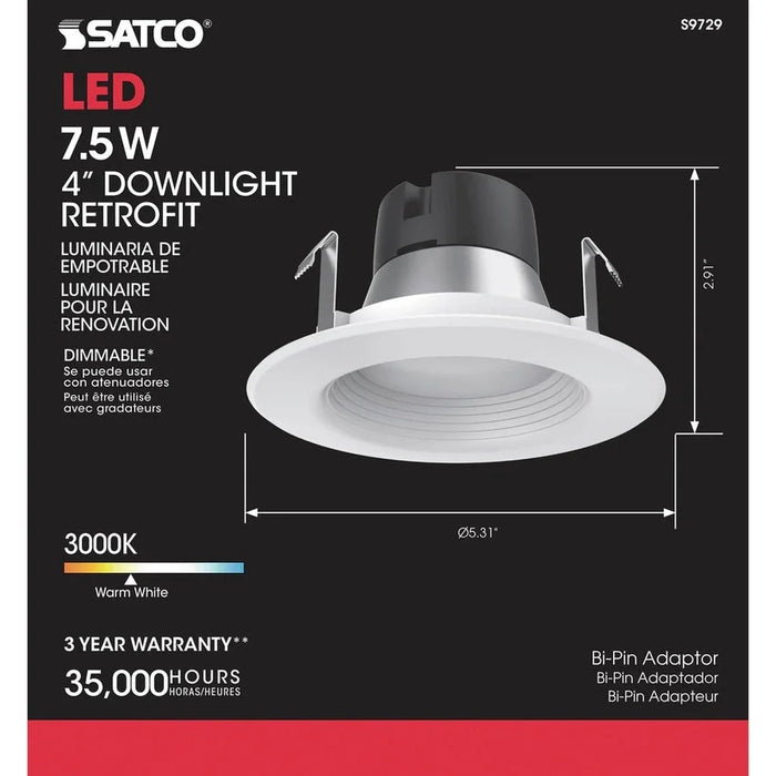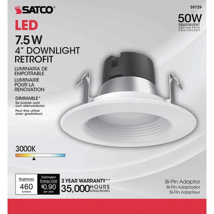 Satco's 7.5 watt, LED downlight retrofit is a versatile, innovative lighting solution for commercial and residential applications. This easy to install, environmentally friendly fixture is compatible with most 4 inch recessed cans. Dimmable, and efficient, this fixture delivers 35,000 hours of warm white light.
