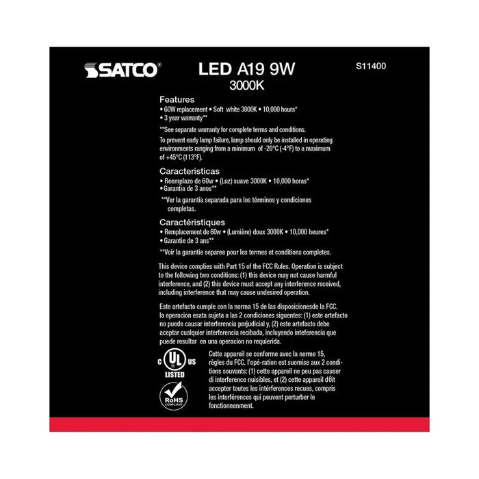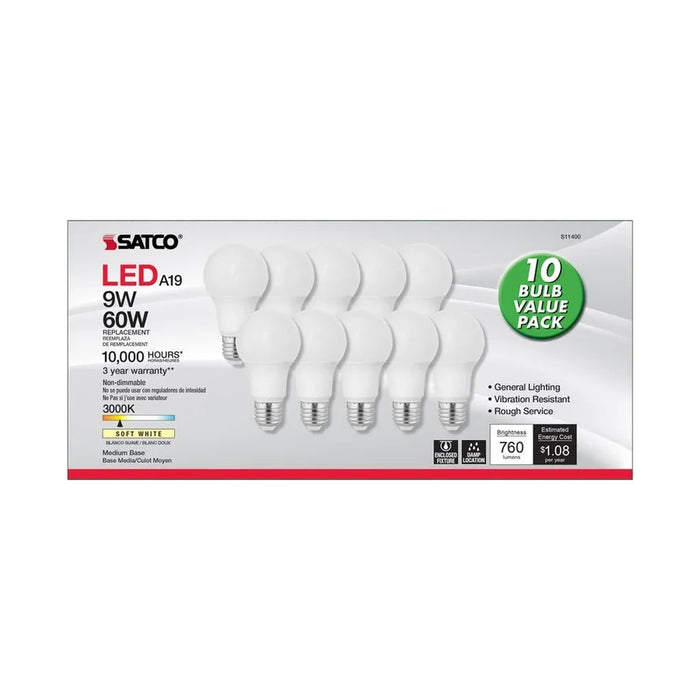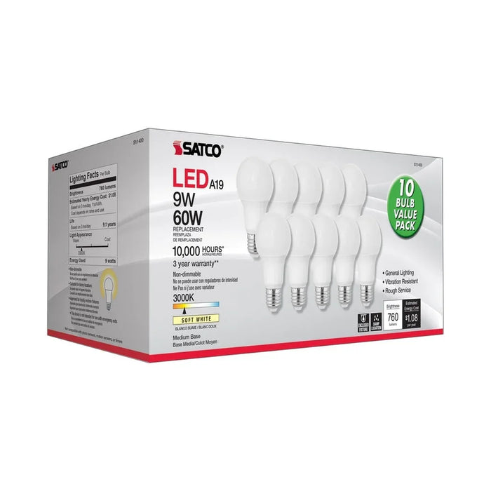 Satco's 9-watt LED frosted bulb features warm white light and a 220 degree beam spread. Illuminate living rooms, dining rooms, and office spaces with this sleek, long-lasting bulb. The bulb's medium base fits all standard lamps and fixtures and delivers exceptional illumination to your room. Available in a 10-pack.