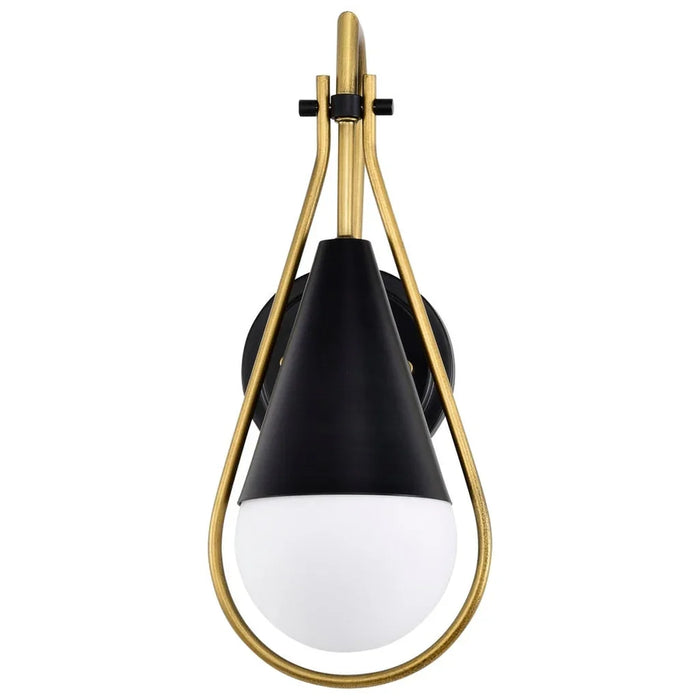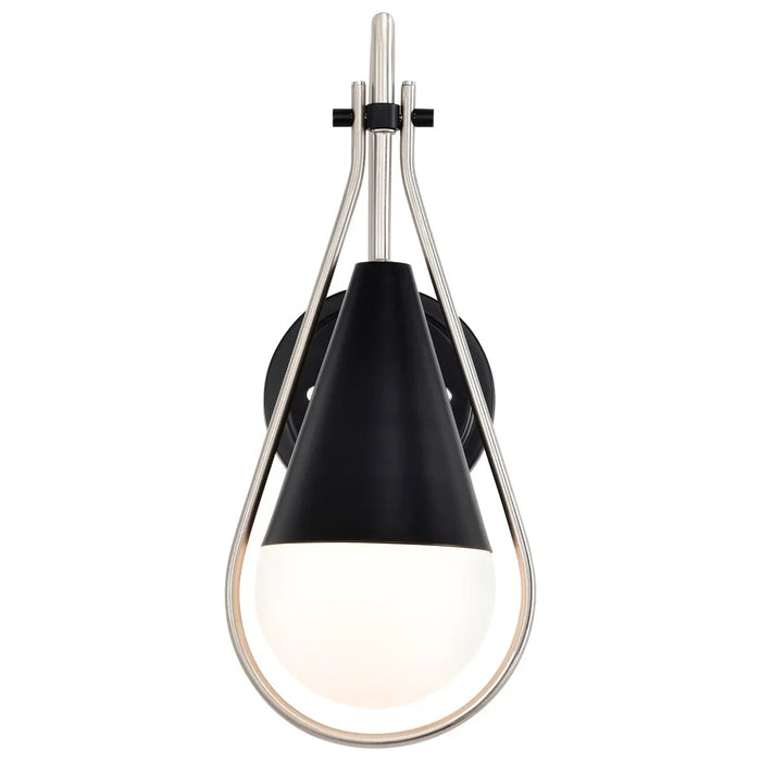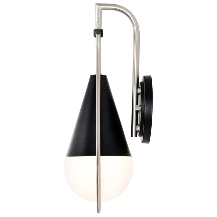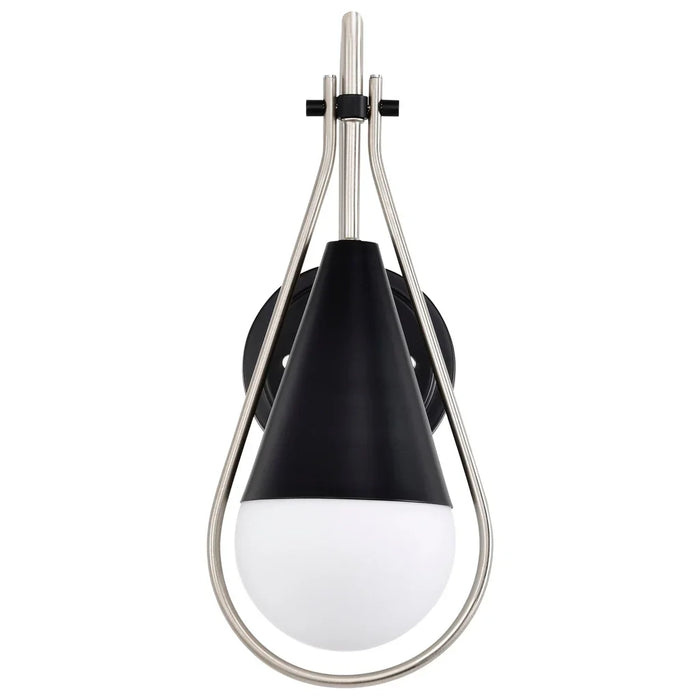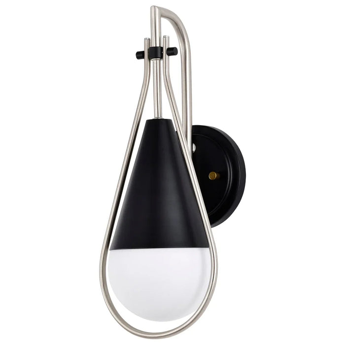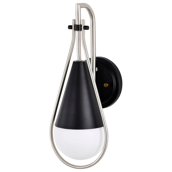 A modern collection with a twist, the Admiral series features a dual finish, unique design, and a fashionable statement for home luminaires. A suspended tear-dropped shape is comprised of matte black with brushed nickel elements encompassing the fixture. The white opal glass orb shields the light source for smooth, even lighting to bring a warm glow to any space. A beautiful design that is versatile and will compliment a variety of home decors.