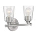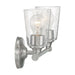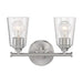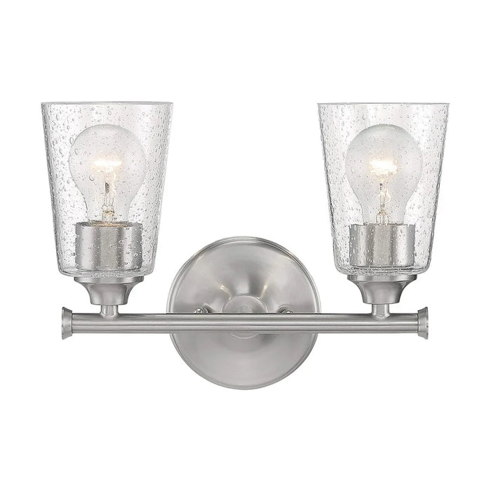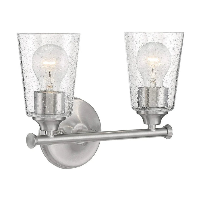 The seeded glass goblet shade accents the Brushed Nickel finish on the Bransel two-light vanity light. The sleek, streamlined appearance of the Bransel compliments both the popular modern farmhouse style or can be at home in a coastal setting. 12 inches wide by 8.875 inches high, the Bransel is damp rated and is perfect over the sink light source for the bath, and can be positioned either up or down.