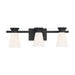 The Caleta three-light wall vanity is an elegant lighting solution for inside the home. Clean lines offset the asymmetry of the frosted white glass shade and brings modern style to any space. The black frame and white shade are a balanced and simple design that is appealing and understated. This versatile fixture is perfect for multiple applications.