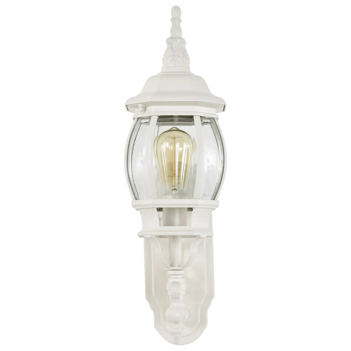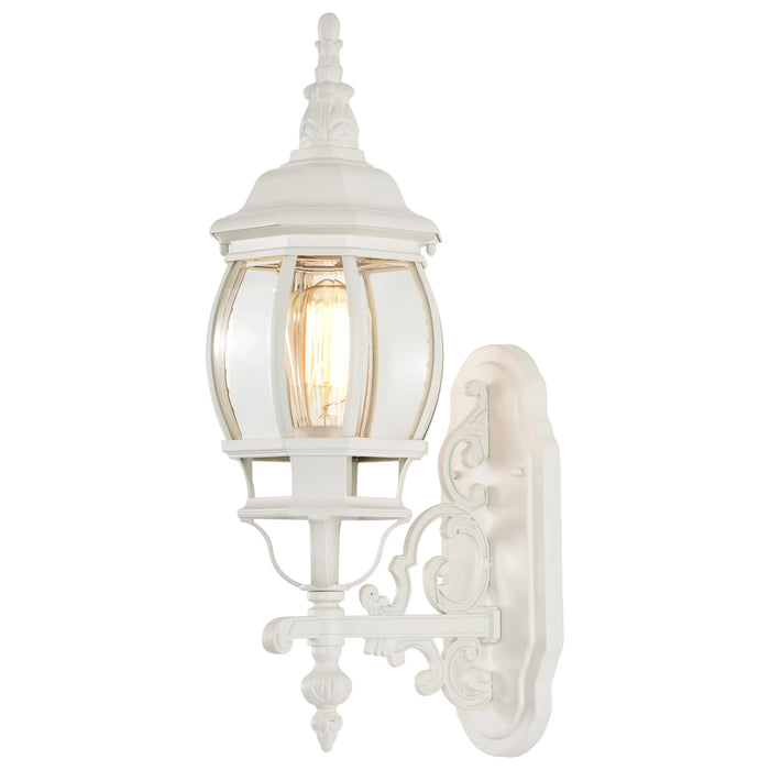 The Central Park 1 light, 20 inch outdoor wall lantern is an elegant lighting solution for outside the home. A single bulb sits elegantly inside clear beveled glass, surrounded by a white finished fixture. Stylish and sophisticated, this outdoor wall lantern is a fashionable lighting solution for the exterior of the home.