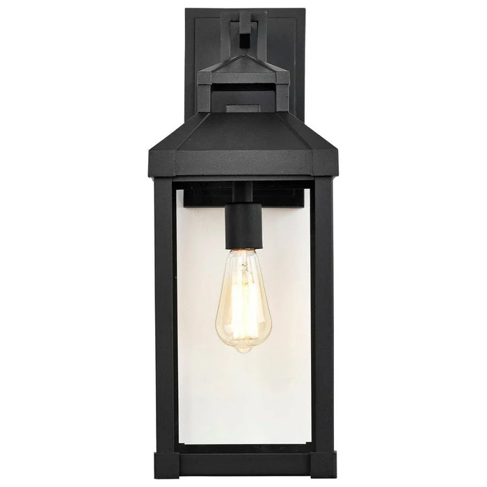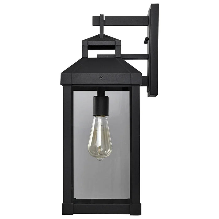 The Corning outdoor large wall lantern features an understated design and timeless style. The carriage-like appearance is enhanced with large clear glass panes, and pairs perfectly with a vintage-style bulb. A deep matte black finish showcases the subtle details on the fixture, housing, and backplate. Neutrality at its finest and is suitable for a variety of home exteriors.