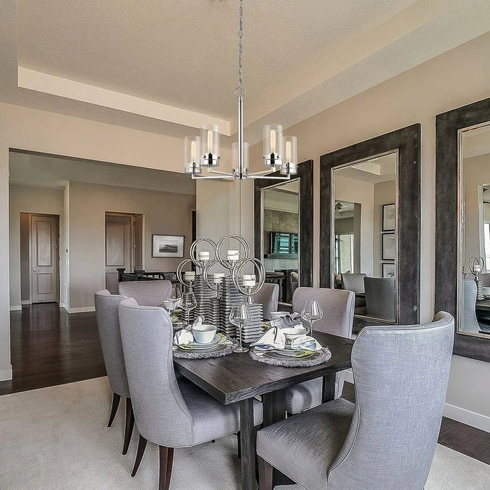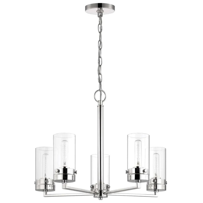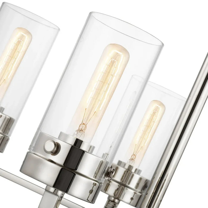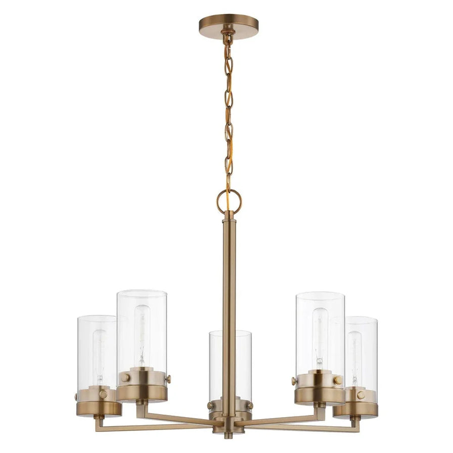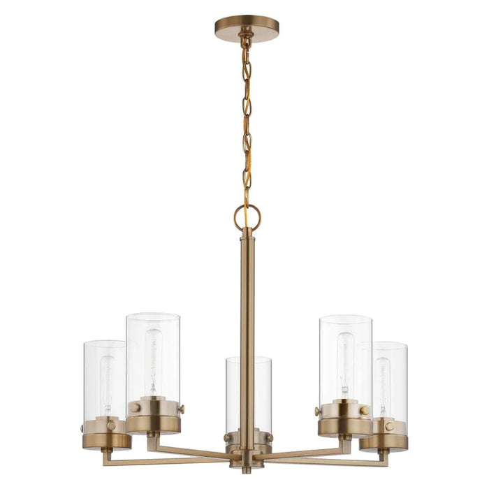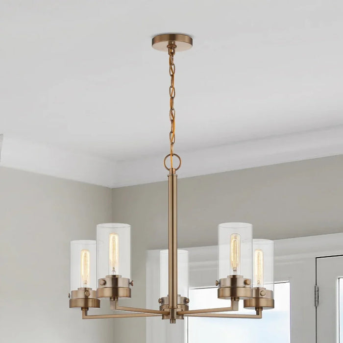 The blend of styles (modern, industrial and chic) is incorporated beautifully into the design of the Intersection chandelier. The cylindrical clear glass shades showcase vintage filament bulbs for a touch of nostalgia. The luster of the rich, burnished brass will pair superbly with existing finishes. Apply to the dining room or over the kitchen island. The Intersection is a stylish addition to any room.
