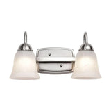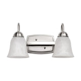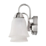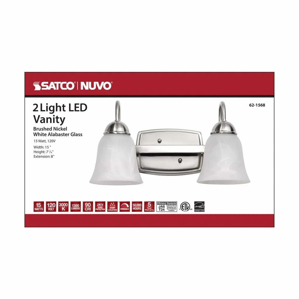 Satco's 15-watt, 2 light vanity is an elegant lighting solution for the home. Classic features and a traditional profile define the style double light vanity fixture. It features integrated LED and an alabaster glass shade, diffusing the light for a soft glow. Its versatile design and brushed nickel finish are perfect for a multitude of home decors.