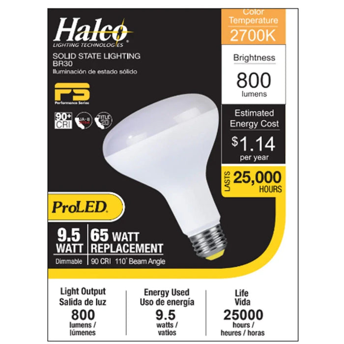 Halco LED BR30 Flood 9.5W 2700K Dimmable 90+ CRI 800 Lumen White Housing T20 T24 JA8-2019 (Performance Series) (6-Pack). Warm White LED BR (Bulged Reflector) Floods.