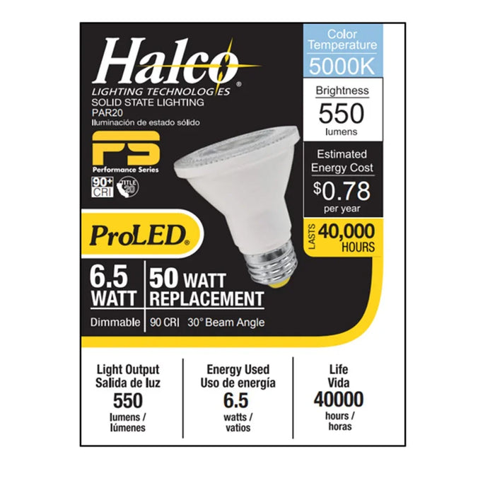 Halco LED PAR20 Narrow Flood 6.5W 5000K 30Deg Dimmable 90+ CRI 550 Lumen White Housing T20 (Performance Series) (6-Pack). Cool White LED PAR Floods.