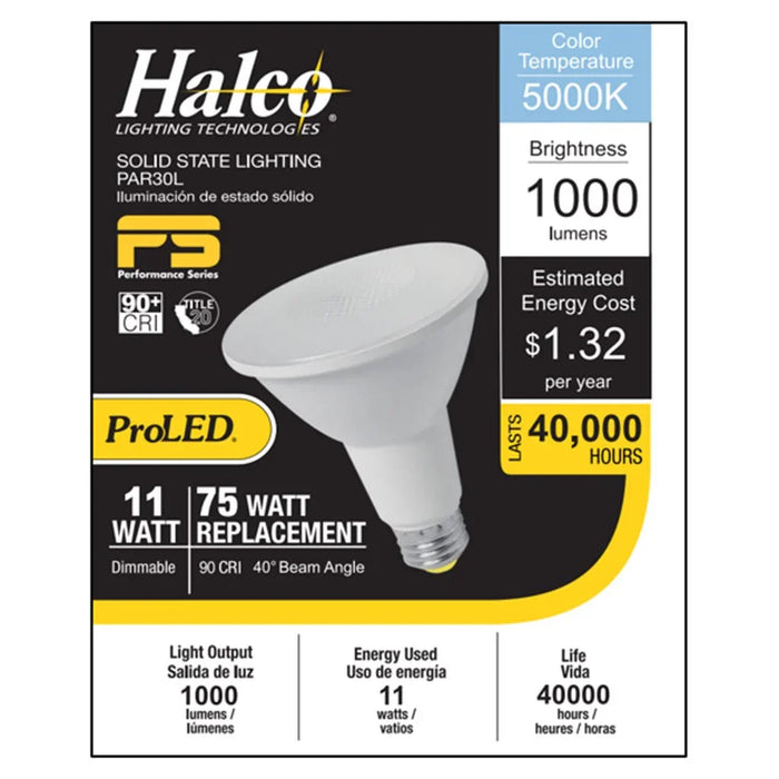 Halco LED PAR30L Flood 11W 5000K 40Deg Dimmable 90+ CRI 1000 Lumen White Housing T20 (Performance Series) (6-Pack). Cool White LED PAR Floods.
